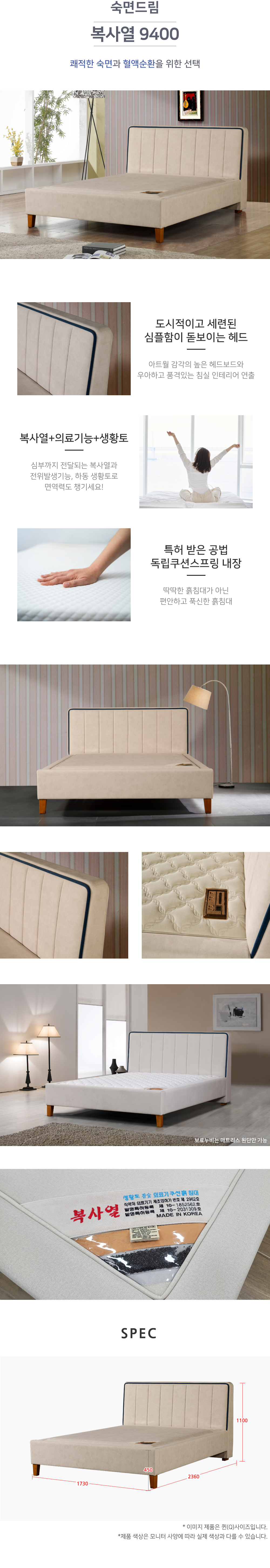 주요소재 기능성패브릭원단, 최고급합판, 생황토, 숯, 원목다리, 실리콘테프론무자계열선, 독립쿠션스프링, 전위판 등